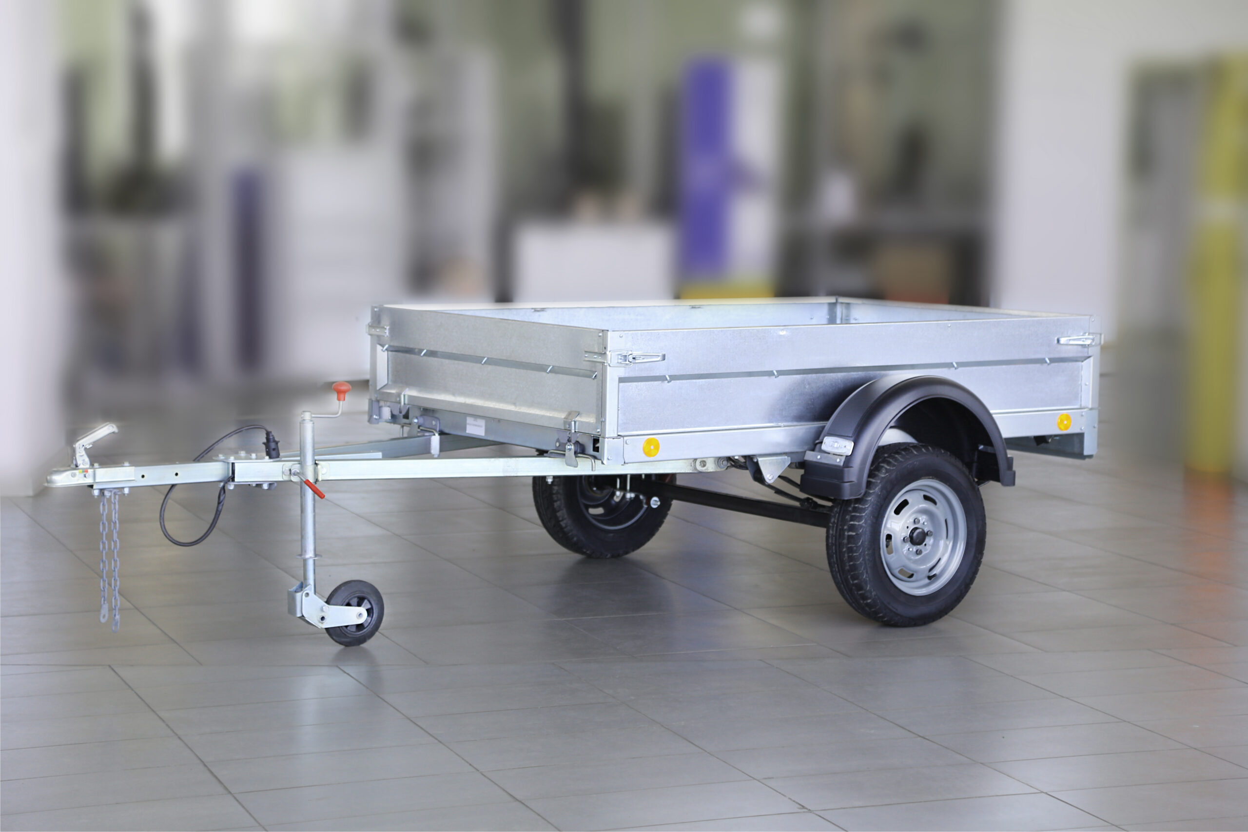 Базовая комплектация прицепа. Оцинкованные рама с дышлом, удлинитель дышла, днище фанерное, основной борт оцинкованный высотой 300 мм, модуль подвески с колесами 13” и 6-листовой рессорой, стандартная панель световых приборов, страховочная цепь. Прицеп имеет самосвальную систему.