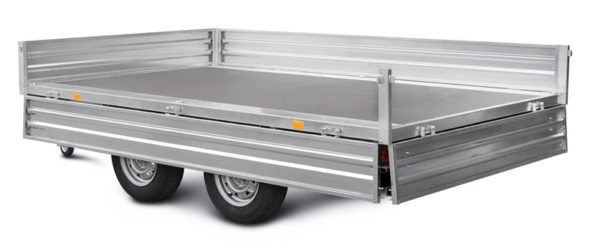 ● Откидные борта дают возможность осуществлять загрузку и выгрузку с любой стороны платформы. Они выполнены из оцинкованного стального листа (толщина 1,5 мм) с дополнительной штамповкой рёбер жёсткости. Рёбра жёсткости позволяют повысить устойчивость бортов к динамическим/ударным нагрузкам. Борта и стойки бортов — съёмные.